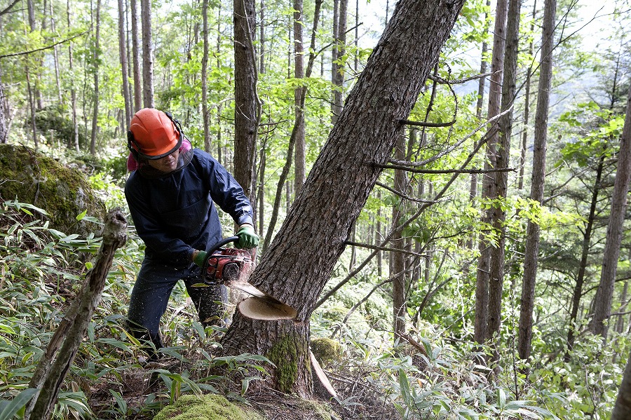 主に機械を使用する為、搬入口の確保を行い必要な立木の伐採を行っていきます。チェーンソーを使って安全で丁寧な作業を心がけております。林業は木を切ってそれを市場に売るだけの職業ではありません。健全な森林を育て、人々の生活や暮らしを支えるという役割を担い、様々な仕事に取り組んでいます。